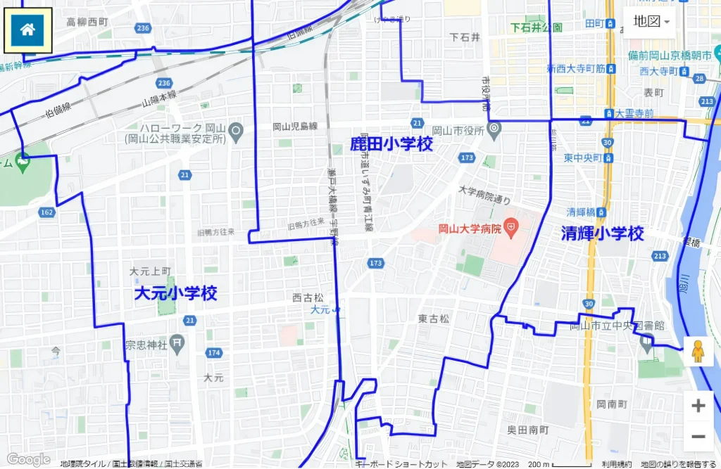 タブをクリックするだけで表示が可能です。小学校区・中学校区と重ねて表示させることもできます。(一部、未対応の地域があります)