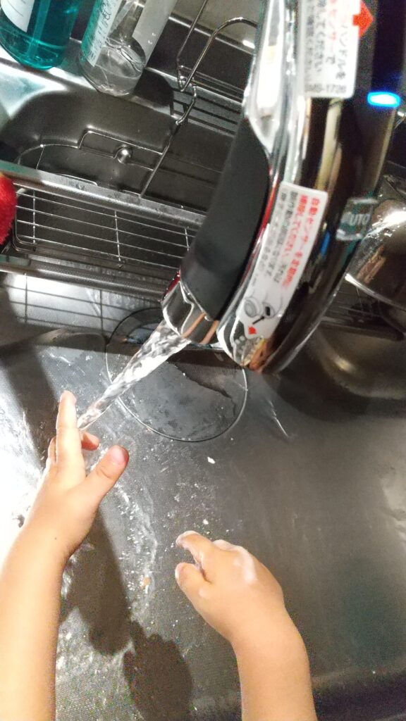踏み台を出してきてキッチンの水栓で手を洗ってくれます。